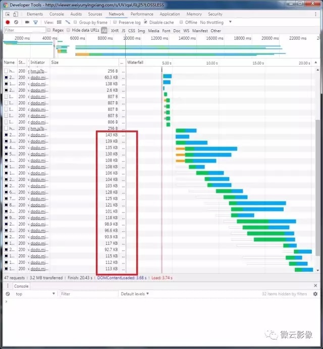 在新版本的压缩算法下,无损影像文件的加载的日志是这样的(见下图)。请重点看图中标红的区域,可以看到单张CT图像的文件大小在100-140K之间,甚至有部分图像是小于100K的。而在我们旧版的图像无损压缩算法下,单张CT图像的大小在200-300K之间。这也就是在上面宣称的相比原来的压缩算法的1-2倍的压缩率的提升,以及相比原始文件的3-5倍的压缩率。