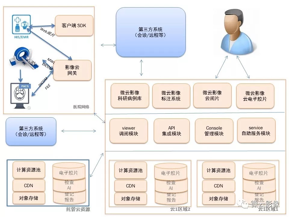 中间层是平台集成层,对外提供统一的系统集成、管理和服务接口,提供了影像上传、调阅、管理、AI、账户验证体系等基础功能。第三方系统(会诊、远程报告等系统)主要在这个层面跟我们的影像云SaaS平台进行集成,由我们的系统在这个层面对底层各种云平台的接口进行适配,从而提供统一的入口和统一的功能。在平台集成层中,我们也提供了入口域名等信息的定制功能。